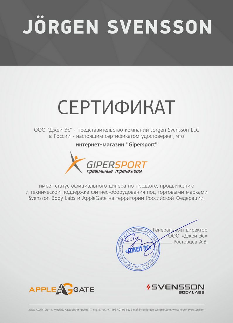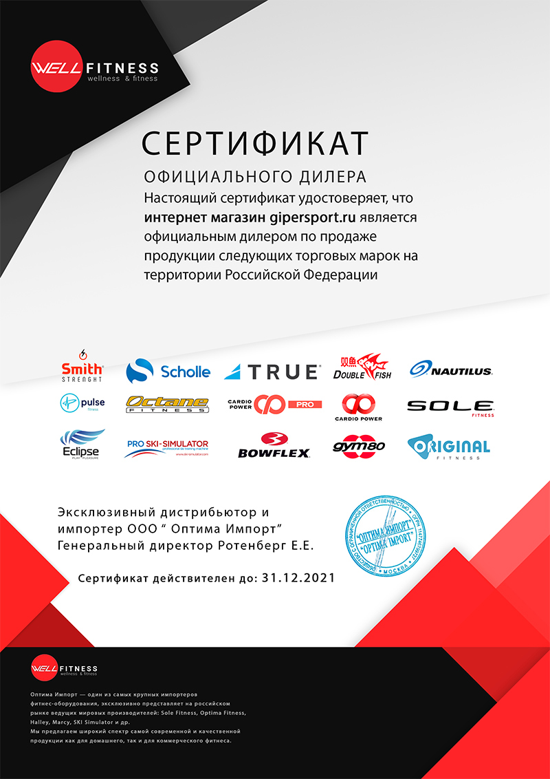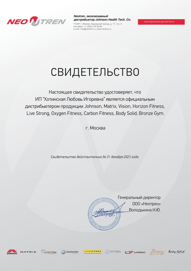 На этой странице нашего сайта вы можете ознакомиться с документами, подтверждающими наше право реализовывать подлинную продукцию ведущих производителей тренажеров. Наши свидетельства официального дистрибьютора продукции Matrix, Vision, Oxygen Fitness, Horizon Fitness, Body Solid, AppleGate и др. станут дополнительной гарантией того, что вы приобретете именно тот товар, о котором мечтали.